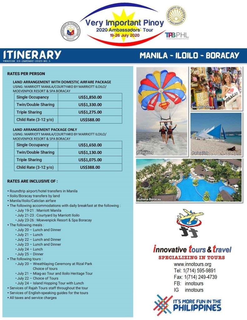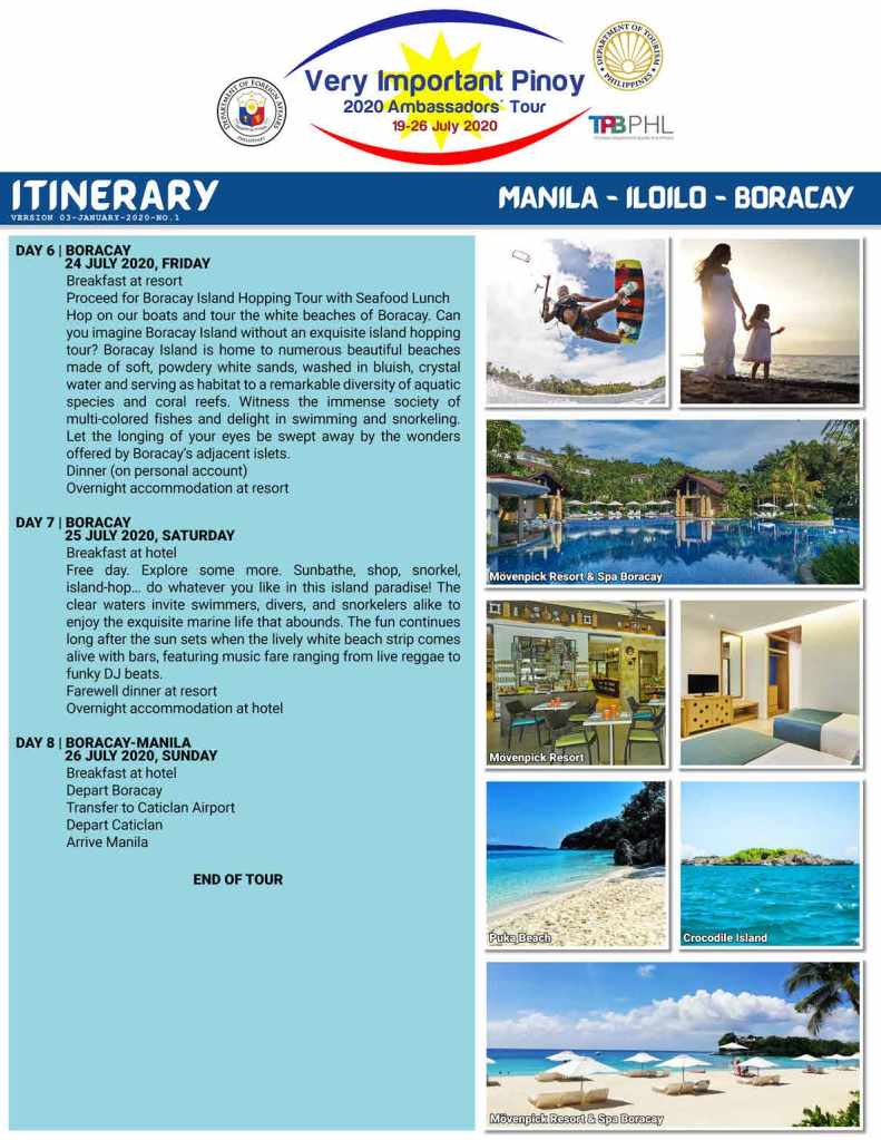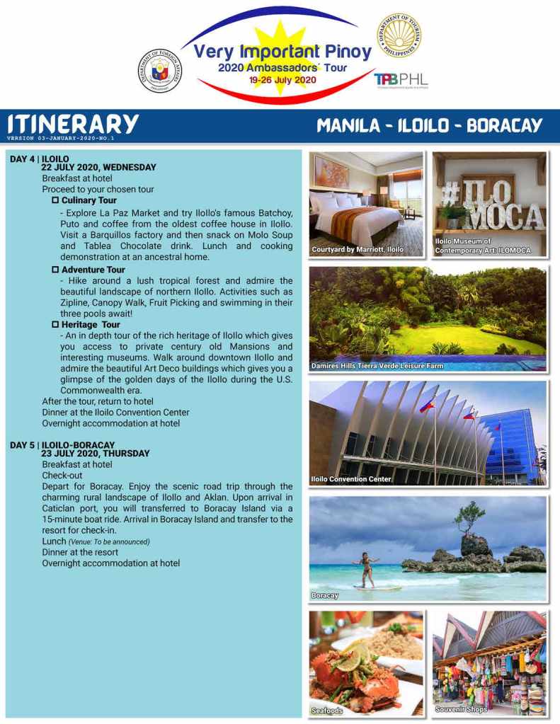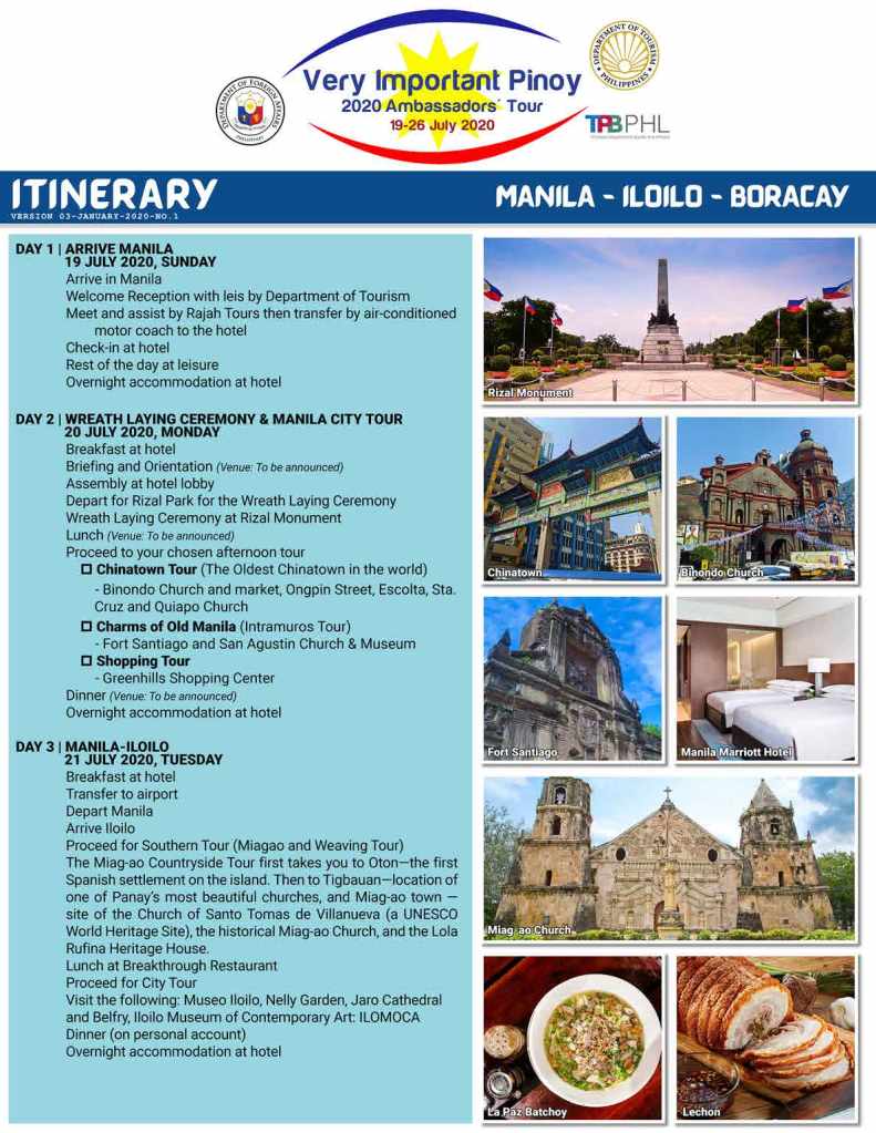 The Very Important Pinoy Tour (2020 Ambassadors’ Tour) will take place in the Philippines on 19-26 July 2020. Led by the Department of Foreign Affairs, in cooperation with the Department of Tourism’s Tourism Promotions Board and Rajah Tours, the itinerary for the tour combines the best of Metropolitan Manila, Iloilo and Boracay into one adventure-packed and enriching vacation experience.